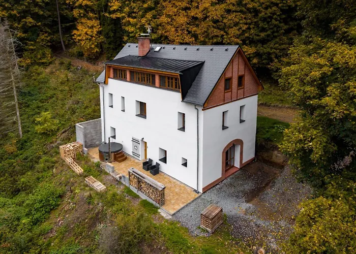 Vila Vila Samota 88, umístěná ve městě Teplice, poskytuje ubytování s vířivkou. Nabízí se terasa s výhledem na hory.